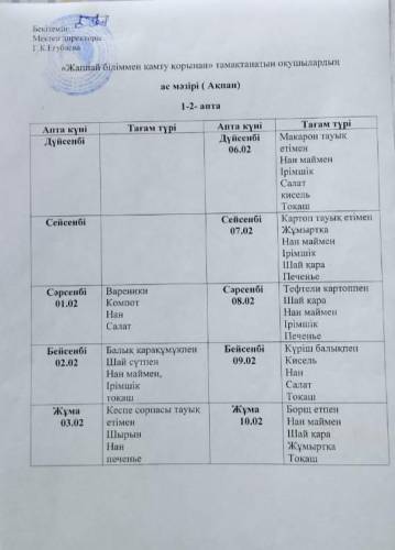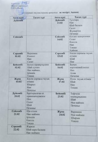 Ақпан айына арналған 1 сынып оқушыларына және жаппай біліммен қамту қорынан тамақтанатын оқушылардың ас мәзірі