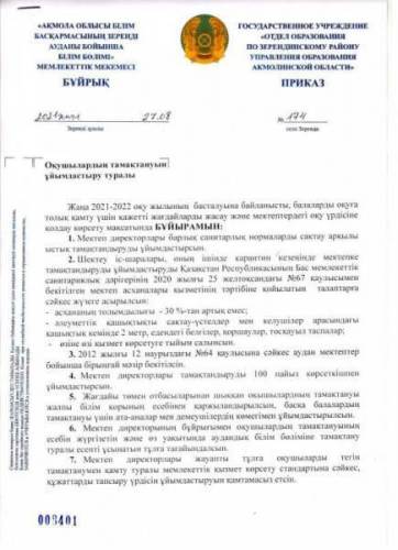 2021-2022 оқу жылына арналған оқушылардың тамақтануын ұйымдастыру туралы бұйрық